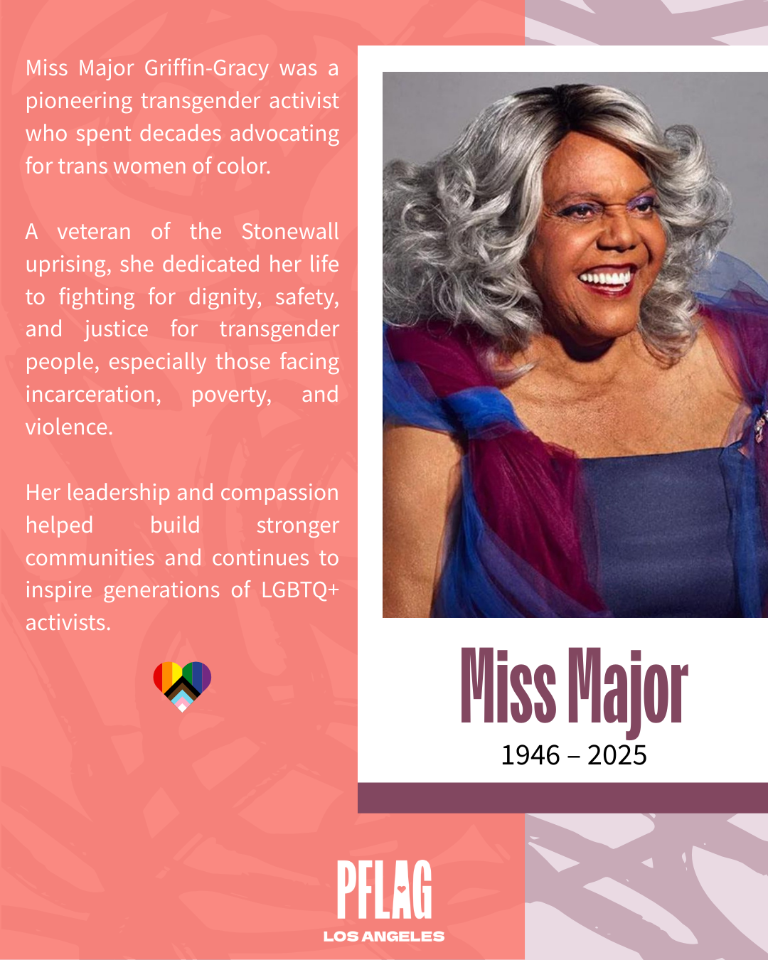 This Women’s History Month, PFLAG Los Angeles honors Miss Major Griffin-Gracy, a Black transgender activist and community leader who has dedicated her life to advocating for transgender women of color.